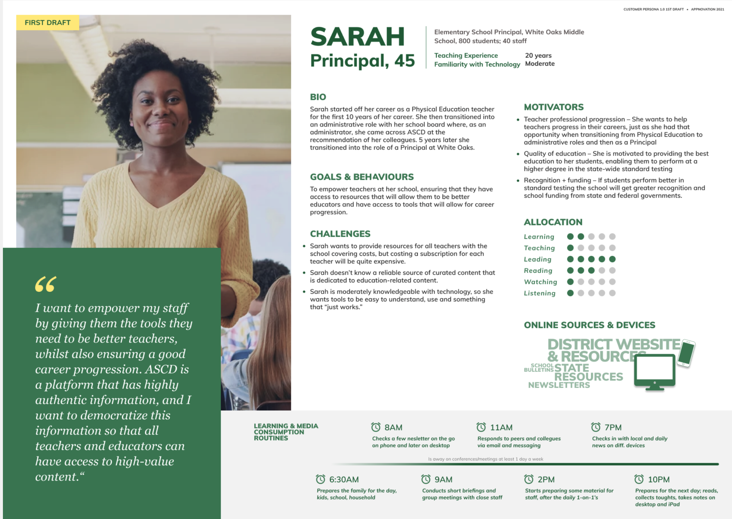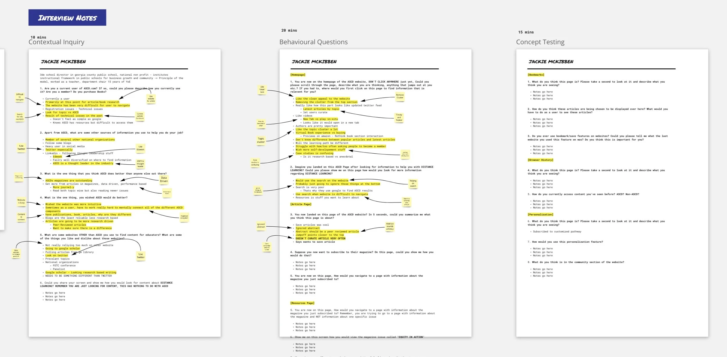 We engaged both internal stakeholders inside ASCD and external stakeholders to better ascertain the goals and objectives of the future state and key pain points facing end users to better understand user behavior. We interviewed nine users, four existing ASCD subscribers, and five nonsubscribers that fit our target audience. We then created 3 Persona types that would guide our designs.